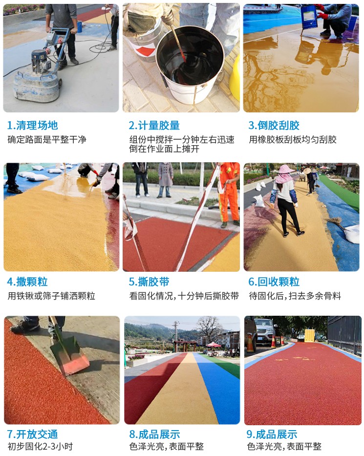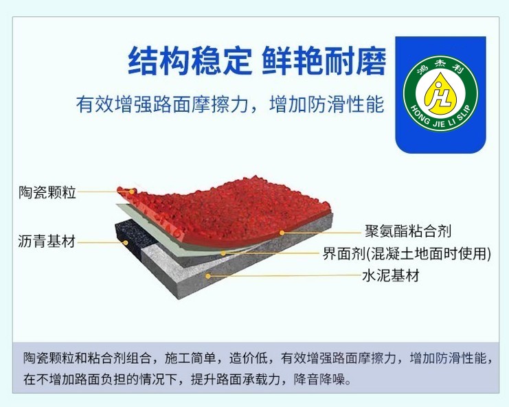 彩色防滑路面的優(yōu)點:防滑性能高,路面散水性好,色彩鮮艷;施工快速容易,鋪設效率高。特別配制的粘合劑固化快:速固化保證了持續(xù)施工,重新開放公路所需的時間大大減少;減少工作場地面積:比其他解決方案可省一半費用;降低噪音:用骨料做成的精細結構有傳導音頻的效果,在水泥路面上使用可以將噪音降低;減少剎車距離:優(yōu)良的防滑性能減少40%的剎車陸離,此外重型卡車在轉彎處剎車不會產生抱死現(xiàn)象;最小的厚度:設計厚度為3-5mm,無須調整街道設施,也不影響排水;色彩鮮艷、可根據客戶要求提供顏色;用于交通減速帶時有很好的視覺和聽覺效果。